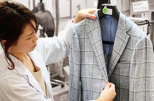 世界の一流アパレルメーカーが、出荷前の最終成形プレスに使用する技術とドイツ製の高性能機械を導入してクリーニングします。平面的ではなく立体的に洋服を仕上げることで、着用により崩れかけているシルエットを新品に近い状態へ復元します。