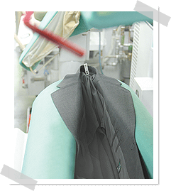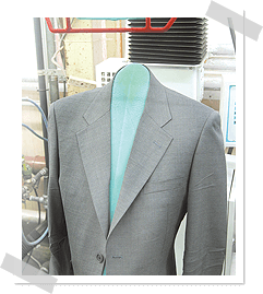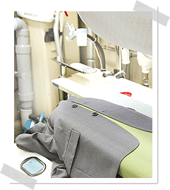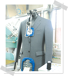 仕上げる。胸ポケット・ボタンまわり・センターベント・サイドベンツ・裏地・背裏などをハンドアイロンでシッカリ仕上げます。